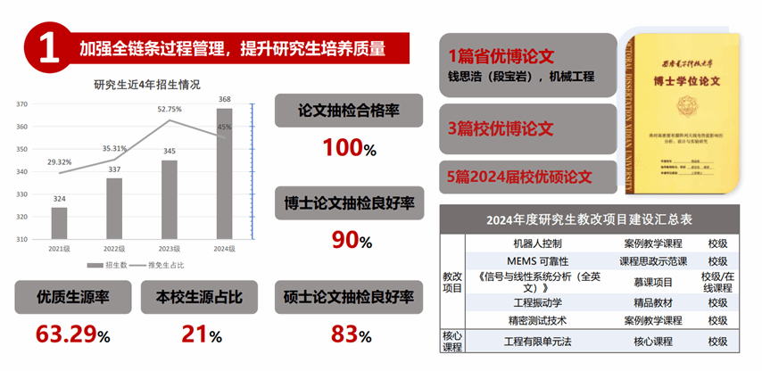加强研究生全链条过程管理,提升研究生培养质量。构建多维度、多层次的生源质量提升策略,推免生接收数、优质生源数实现持续增长。深度参与卓越工程师教育的高质量发展,形成“五位一体”的育人新范式,新增“北方华创-西电复杂控制联合培养基地”等校院级联合培养基地2个。1篇博士生学位论文入选“陕西省优秀博士学位论文”;获批3篇校优博论文,5篇2024届校优硕论文。拓展优化学位点布局,增强学院办学实力,力学获批博士学位点。