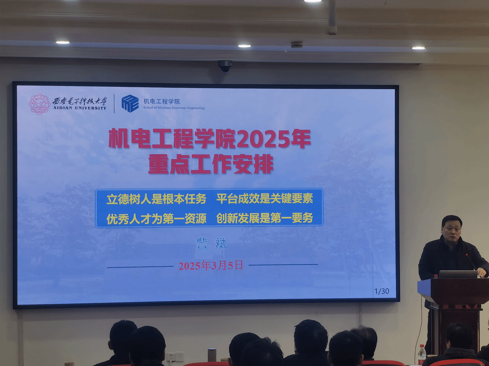 随后,梁玮专题传达学校了2025年工作会议精神,重点解读学校“双一流”建设新目标、教育教学改革新举措及全面从严治党新要求。他强调,全体教职工要锚定学校“十四五”规划任务,以党建为引领,深化“三全育人”综合改革,筑牢意识形态阵地,为学院发展提供坚强政治保障。