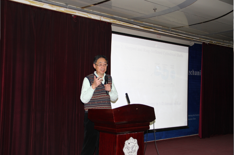 报告会上,杨秉恩教授首先就目前所从事的主要研究领域包括多弹头武器智能导航、智能材料、形状记忆聚合物复合材料、无线无源传感器、水润滑橡胶轴承等进行了简要介绍,随后重点报告了其所提出的薄膜褶皱建模分析方法以及板壳动力学分析的分布传递函数法。在薄膜褶皱建模分析方法的报告中,杨教授就已有各研究方法的特点与不足进行了详尽的综述,并详细介绍了其所提出的双参量薄膜模型,通过丰富的算例展示了该方法在完整模拟薄膜褶皱形成过程方面的优势,同时对该方法进行了总结和展望。在板壳动力学分析的分布传递函数法的报告中,杨教授从一维偏微分方程的数值求解方法开始,通过推演的方式给出了通过传递函数方法所得到的封闭形式的解,并结合具体的实例展示该方法可以高效、灵活的应用于实际工程结构静、动态行为的分析中。整场报告内容丰富、深入浅出,极大地开拓了在场师生的学术视野和研究思路。