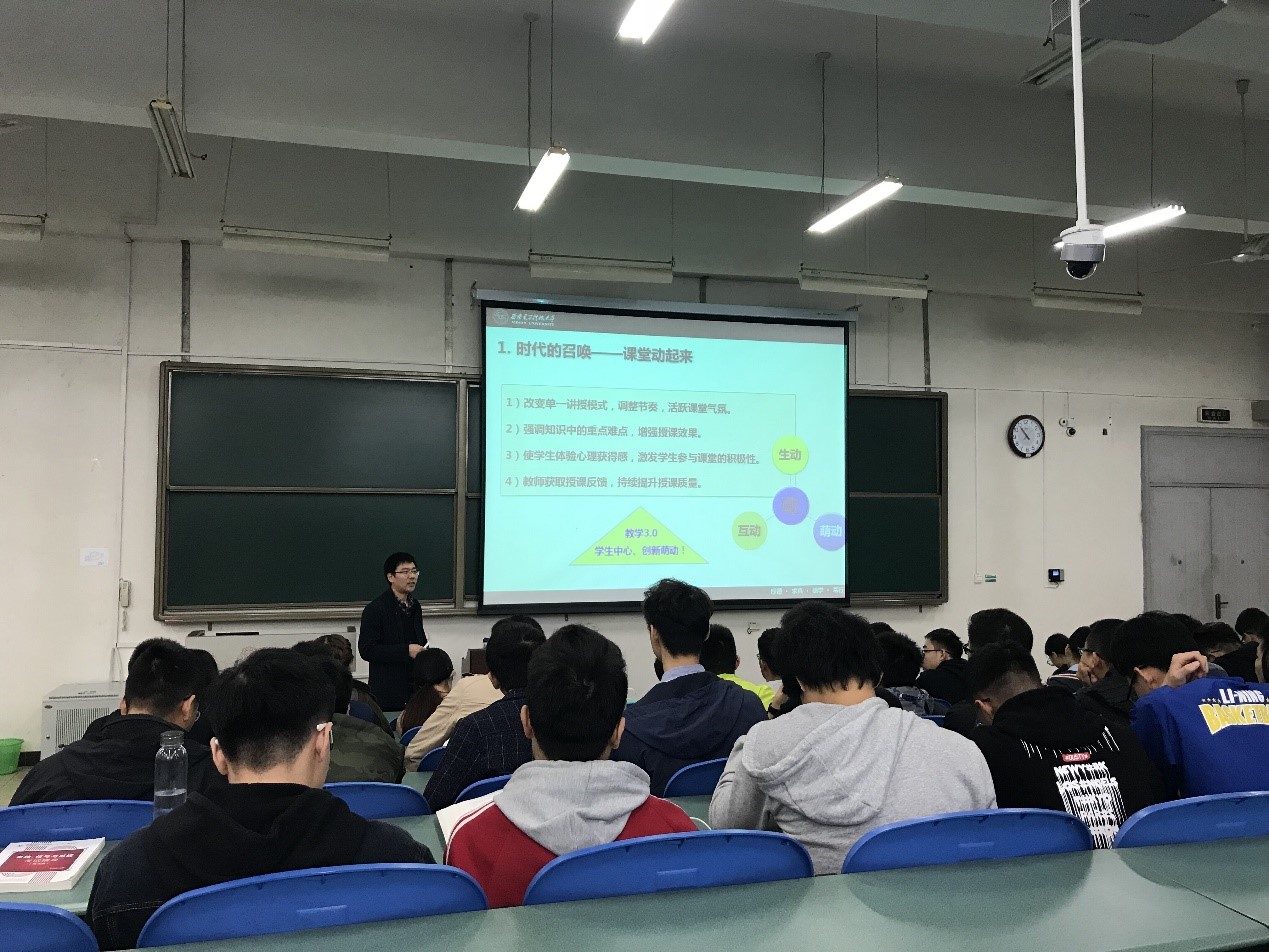 接着,他又向同学们一一展示了雨课堂上课堂互动的新技术:“灵活的课前学习”,“快捷的课上测验”,“创新的师生互动”,“完善的作业题型”,“全景的数据驱动“等,通过现场实例展示了在大数据背景下,采用新技术可以更利于老师了解学生学习情况,学生也可以更好的与老师互动。