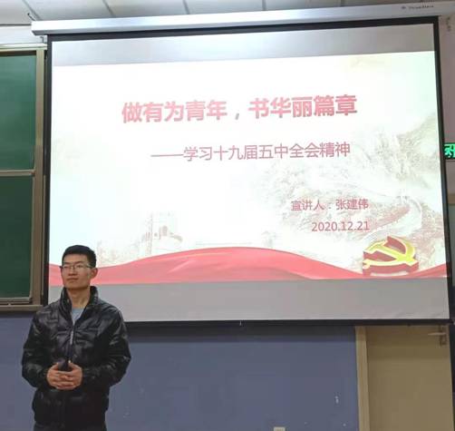 (通讯员 张建伟 周蕾)2020年12月21日19时,必赢242net官网于北校区阶梯教室305进行了十九届五中全会精神宣讲活动,并取得圆满成功。此次宣讲会的宣讲人为研究生支部书记张建伟,主题为“做有为青年,书华丽篇章”。必赢242net官网全体党员、发展对象以及积极分子参加了此次学习活动,并于会后积极发表感言和收获。