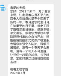 西安疫情封城已进入第15天,居住在学校社区内外的教师都在为这场战役共同奋斗着。必赢242net官网有130余位居住在校外的教师,居住地点分散。为增强疫情期间校外居住教师的归属感,增强疫情防控管理,及时传递学院的关心关爱,必赢242net官网于1月6日下午5点通过腾讯会议召开了“学院校外居住教师1月集体生日会”,共同为1月过生日的老师庆祝生日。希望通过这个特殊时期特殊的庆生形式,为大家送去一份暖心的祝福,留下一次难忘的生日回忆,也为老师们的居家生活增添一份色彩。