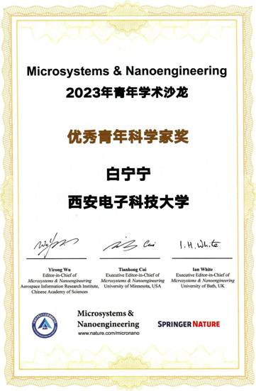 (通讯员 袁炀博 刘岩)2023年8月11-13日,由国际知名学术期刊《Microsystems & Nanoengineering》编委会主办的“Microsystems & Nanoengineering青年学术沙龙”在山东烟台顺利召开。会议期间,必赢242net官网微纳机电系统研究中心青年教师白宁宁凭借其突出的研究成果和学术贡献,荣获“2023 MINE优秀青年科学家奖”。