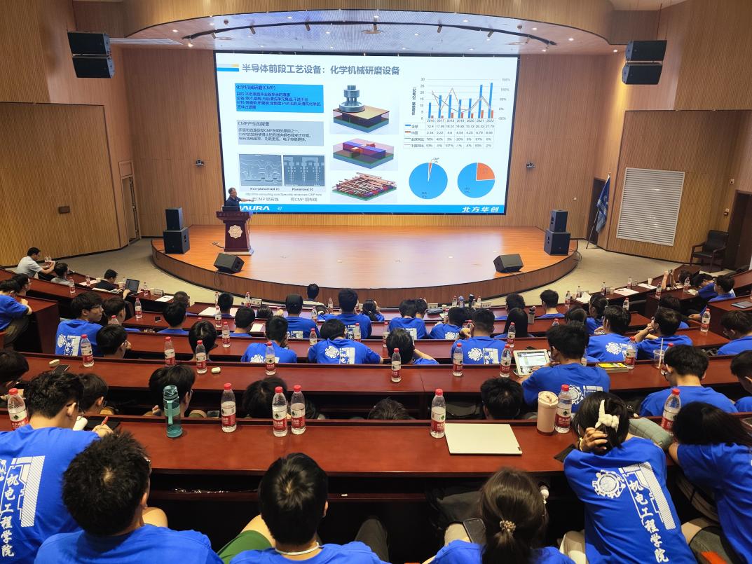 成立仪式结束后,北方华创专家王铮为学院师生作了关于“集成电路装备产业介绍”的专题报告,他在报告中谈到,集成电路产业要实现从跟踪走向引领的跨越,装备产业将是重要环节,必须坚定不移的以装备创新推动集成电路产业不断发展。自强班全体同学认真聆听了报告,报告结束后,自强班的同学踊跃提问,企业专家耐心细致的一一作了解答。最后,与会人员共同合影留念。