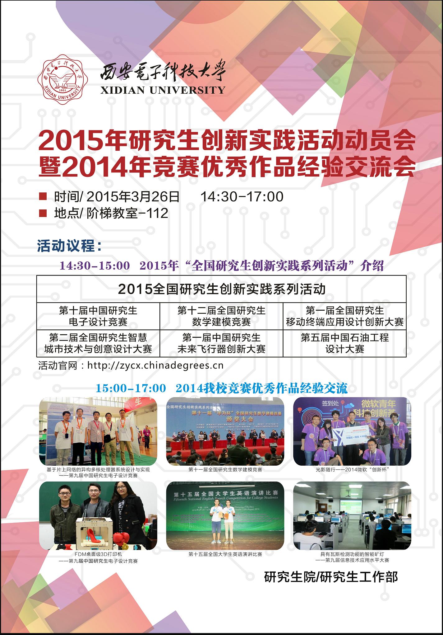 阶梯教室112召开“必赢242net官网2015年研究生创新实践活动动员会暨2014年竞赛优秀作品经验交流会”。届时,将向大家介绍2015年研究生创新实践活动六大赛事的具体情况,并由 2014年度竞赛获奖优秀队伍介绍参赛经验。