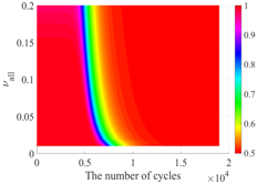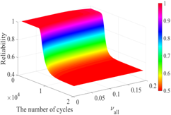 图2 热-结构-噪声耦合下结构疲劳可靠度随结构参数随机性和载荷循环次数的变化