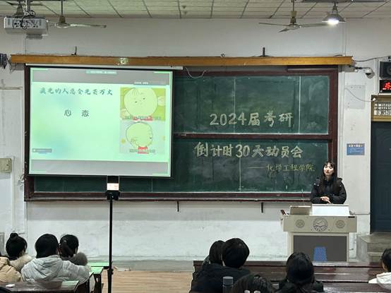 为做好2024届考研学子考前思想心理疏导、鼓舞动员工作,化工学院于2023年11月23日召开了考研倒计时30天冲刺动员大会。学院领导、专职辅导员、学院部分考研学子参加了活动。