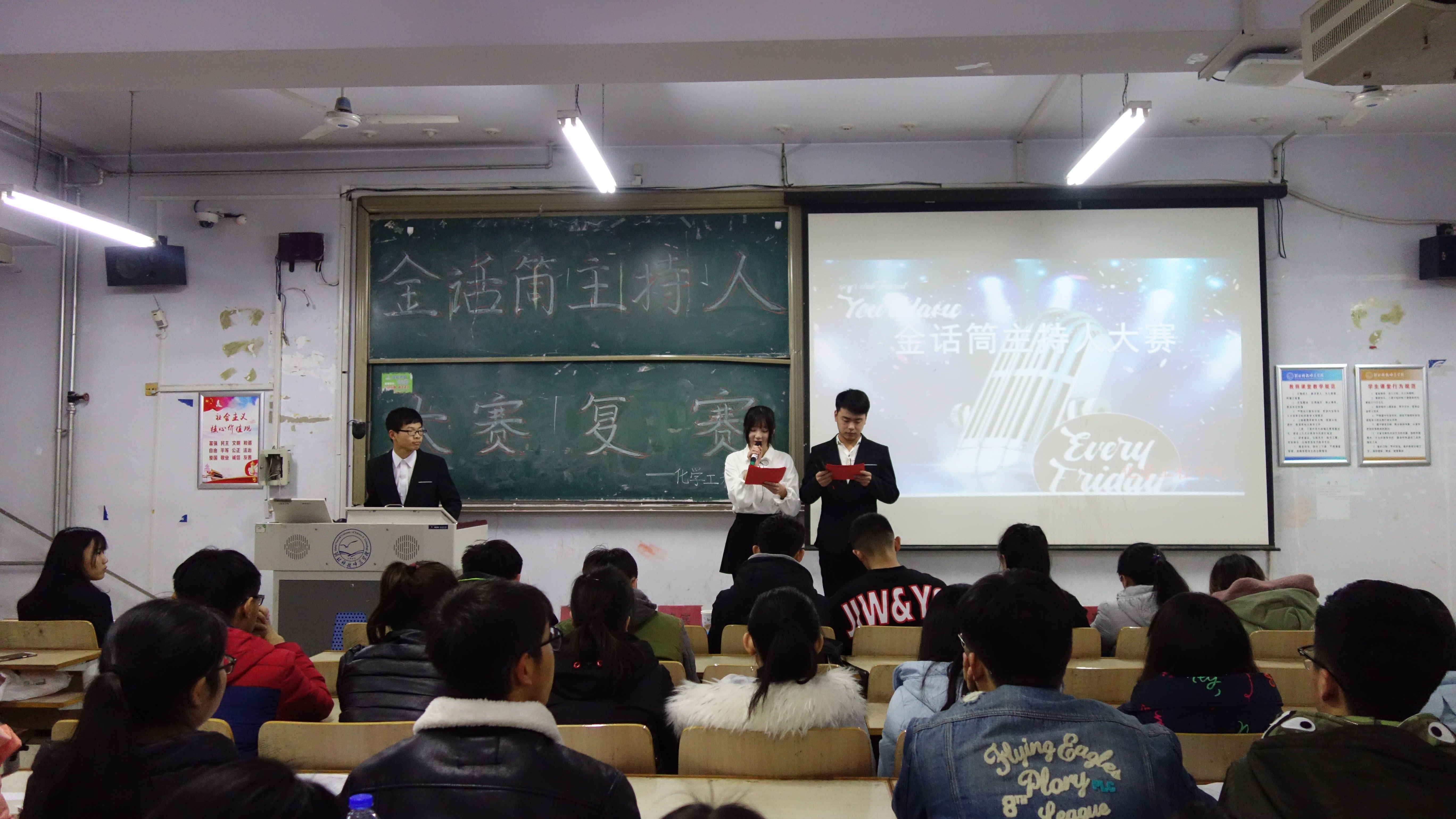 2017年12月6日,pp电子官方网站在1-C108举办了“金话筒”主持人大赛复赛。pp电子官方网站团委负责人、学生会主席、校十佳主持人及90名学生参与了本次活动。