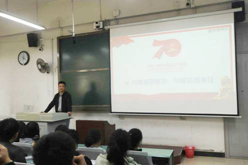 为庆祝中华人民共和国成立70华诞,必赢242net官网于10月21日下午4:00,在南校区A205以“70年披荆斩棘,70年风雨兼程”为主题开展主题党课,主讲人为学院党委副书记田雨。参加本次主题党课的有:各班班干部,学生组织主要干部,各辅导员老师。