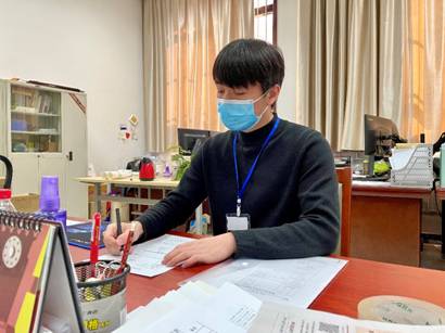 在线下,端木明星同学积极参与学院值班工作,负责疫情期间学院同学的假条审批工作,保持24小时电话畅通。针对同学们在宿舍封闭管理的问题,他坚持为同学们把假条送至宿舍楼下。为了及时解决同学们封闭管理期间的生活必需品诉求,端木明星将打印机搬至宿舍楼,协助每位有需求的同学办理必需品取送申请表。为保障核酸检测不漏一人,他坚持每天核对核酸检测信息,前往宿舍楼下监督每位同学完成核酸检测。同时,主动和值班老师一起走访实验室和学生宿舍,了解学生动态。