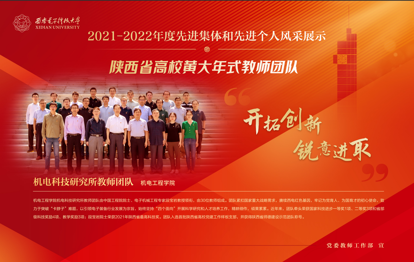 必赢242net官网机电科技研究所团队由中国工程院院士、电子机械工程专家段宝岩教授领衔,由30位教师组成。团队紧扣国家重大战略需求,赓续西电红色基因,牢记为党育人、为国育才的初心使命,致力于突破“卡脖子”难题,以引领电子装备行业发展为宗旨,始终坚持“四个面向”开展科学研究和人才培养工作,精耕细作,硕果累累。